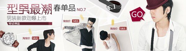 6例是男裝的banner設(shè)計(jì),大家在設(shè)計(jì)男裝時(shí)可以很好的妙用直線條,因?yàn)橹本€條是最好表現(xiàn)男性特征的一個(gè)設(shè)計(jì)元素。在生活中不難看見(jiàn)直線是眾多的男性品牌logo設(shè)計(jì)的根本元素。