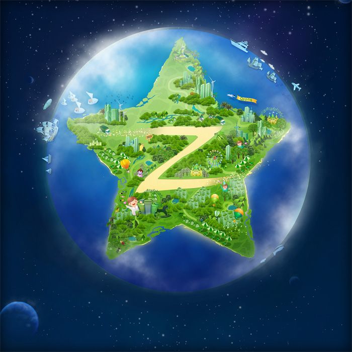 這樣的表現(xiàn)形式得到了大家一致認同,不過“ing…”代表什么意思吶?恐怕很難讓人馬上理解。形式很好,內容需要優(yōu)化!因此我們沿著這個方向發(fā)散,從內容上考慮新的表現(xiàn)。就這樣地球村的想法孕育而出。空間SNS平臺聯(lián)系著千萬用戶,我們在空間里寫日志、貼照片、停車、種水果、買賣好友…地球村這不正好是Qzone最好的表達嗎?想法出爐后,時間緊迫,熬夜是必然了。星球、綠地、樹、房子、道路,地球村漸漸有了模樣。