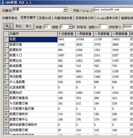 以前百度會(huì)提供相關(guān)搜索更多頁(yè)面,但是后來(lái)被百度關(guān)閉了,只有競(jìng)價(jià)用戶才能看到,這部門關(guān)鍵字?jǐn)?shù)據(jù)是非常有用的,之后便產(chǎn)生了很多的關(guān)鍵字選取軟件,軟件的數(shù)據(jù)來(lái)源是百度指數(shù),也就是原先的相關(guān)搜索,比如最常見(jiàn)的有SEO伴侶,SEO助手(這兩款都是付費(fèi)軟件)免費(fèi)的也可以用,但是出來(lái)的關(guān)鍵字很少,而且可能還被禁止導(dǎo)出,SEO伴侶我一直在用,價(jià)格一年也就幾十元,我記得好像是35元!SEO助手價(jià)格相對(duì)比較貴,但是里面除了這個(gè)功能外,其他功能還有很多,還有最新的一個(gè)網(wǎng)站叫追詞網(wǎng)(http://www.zhuici.com/ )這個(gè)網(wǎng)站不需要給錢,但是需要用一個(gè)PR=3的鏈接換取VIP會(huì)員級(jí)別,有資源的可以去用一下!下面我以SEO伴侶為示范,找出“股票”相關(guān)的關(guān)鍵字~~