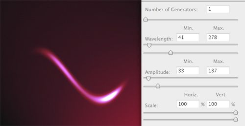 從這步開始變的很有意思。有兩個濾鏡可以使光效變的像光紋:波浪(濾鏡》扭曲》波浪)和(濾鏡》扭曲》旋轉(zhuǎn)扭曲)。用波浪可以制作各式各樣不規(guī)則的紋路。像其他濾鏡一樣,可以調(diào)節(jié)滑塊來取得理想的效果。但是或許應(yīng)該適當調(diào)大波長和波幅。同樣,試著在同一圖層多次運用“波浪” 濾鏡。
