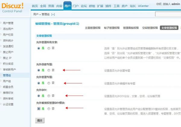 允許被授權(quán)管理文章:設(shè)置是否允許管理員給此用戶組單個成員分配管理一個或多個頻道欄目文章的權(quán)限,需進(jìn)入頻道欄目進(jìn)行單獨設(shè)置;允許創(chuàng)建專題:設(shè)置是否允許創(chuàng)建專題;允許管理專題:設(shè)置是否允許編輯所有專題;允許DIY:設(shè)置是否允許DIY論壇,文章,空間,論壇等頁面;允許被授權(quán)管理DIY模塊:設(shè)置是否允許管理員給此用戶組分配管理DIY模塊的權(quán)限,包括首頁、頻道、專題、文章、空間、論壇等頁面的權(quán)限,需進(jìn)入頻道管理,專題管理,DIY頁面管理進(jìn)行分別設(shè)置。