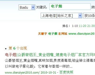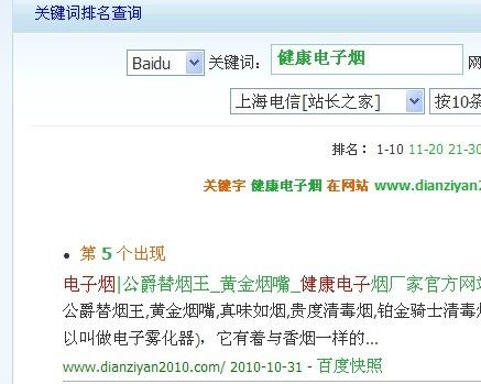 收錄內(nèi)頁以后的第1天,關(guān)鍵字排名放出來了,關(guān)鍵字:電子煙 排名11