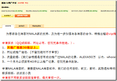 這個計劃一定要是審核的,而且審核時要高要求,要嚴(yán)格。比如我們,月推廣30單以上,才可以申請,每月定期審核,月推廣沒達到40單的,清理出去。申請時,沒達到標(biāo)準(zhǔn)的,我們會請他去申請其他計劃。要保證這個VIP計劃確實是高標(biāo)準(zhǔn)的,特別為獎勵大淘客去設(shè)置的。